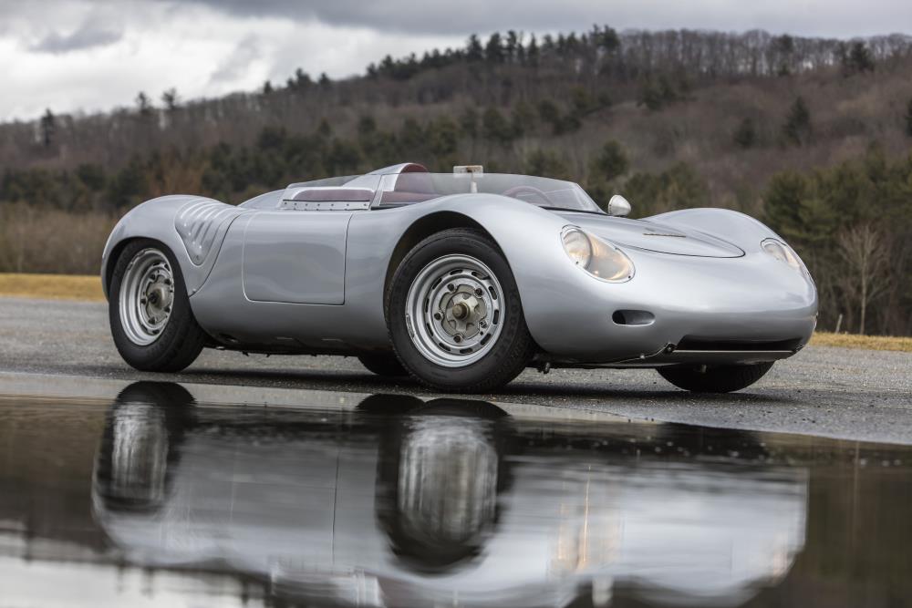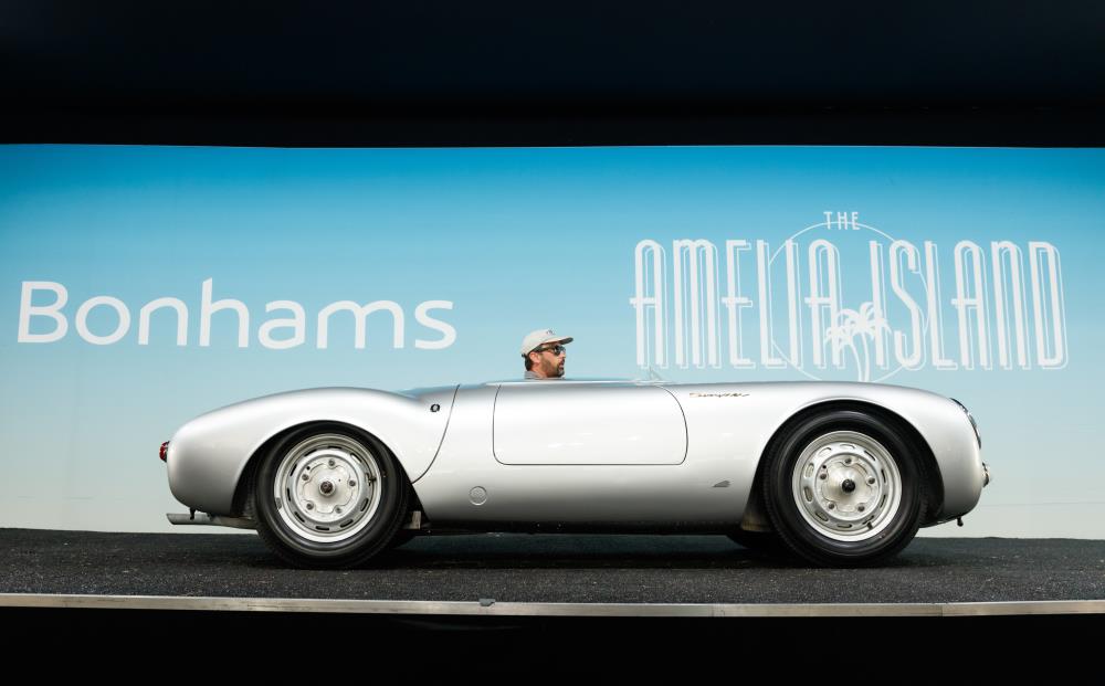 The 1954 Ferrari 500 Mondial Spider, period-raced, restored, Classiche certified, sold for a results topping 3,713,500 euros (£3,159,875 including premium, albeit £473,925 below estimate). The 1957 Porsche 550A Wendler Spyder, driven past the RM Sotheby’s grandstand with the driver sheltering from a shower under an umbrella, made 3,380,000 euros (£2,873,000, just under guide price).